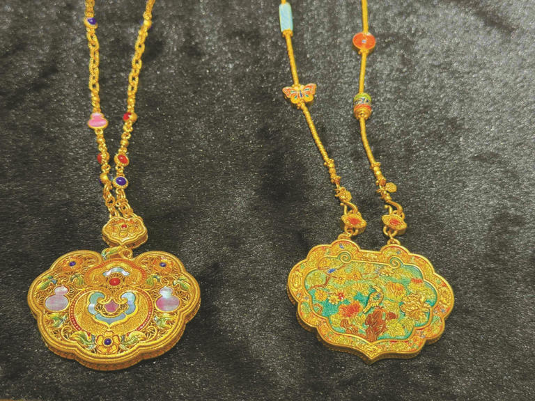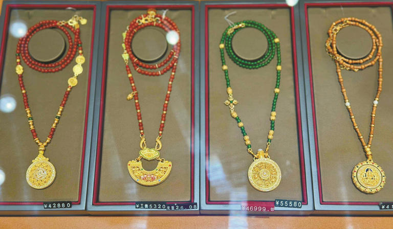 记者走访多个品牌看到,在擦拭得锃亮的珠宝柜台里,一条30多克的古法黄金手链售价动辄五六万元,五六十克的黄金项链售价更是超10万元。不少工艺复杂的古法金、珐琅彩等黄金产品,仅工费就达五六千元。