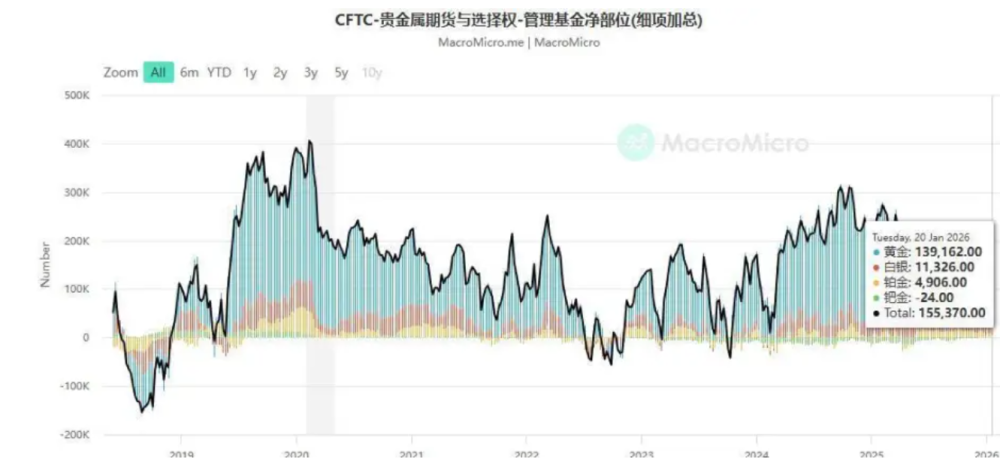 金融机构对金价前景的分歧凸显了市场博弈的激烈程度。 高盛将2026年底金价目标上调至5400美元,杰富瑞集团甚至看涨至6600美元。 但技术指标已发出超买信号:RSI持续处于70以上高位,日线与4小时线形成顶背离,投机资金净多头头寸创2020年8月以来新高。 正信期货分析师蒲祖林警告,当前金价可能已透支未来十年增长空间,对标1980年极端情形,短期高点或触及5200美元,但需警惕避险溢价褪去后的估值回归。